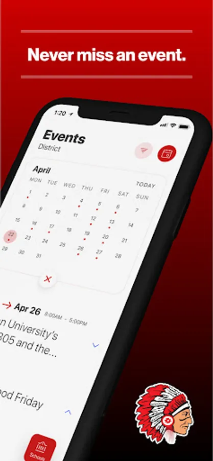 The event section shows a list of events throughout the district. Users can add an event to their calendar to share the event with friends and family with one tap.