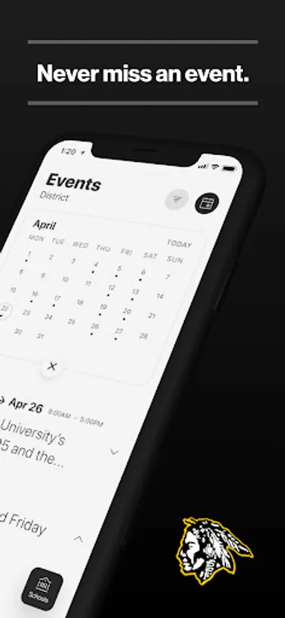 The event section shows a list of events throughout the district. Users can add an event to their calendar to share the event with friends and family with one tap.