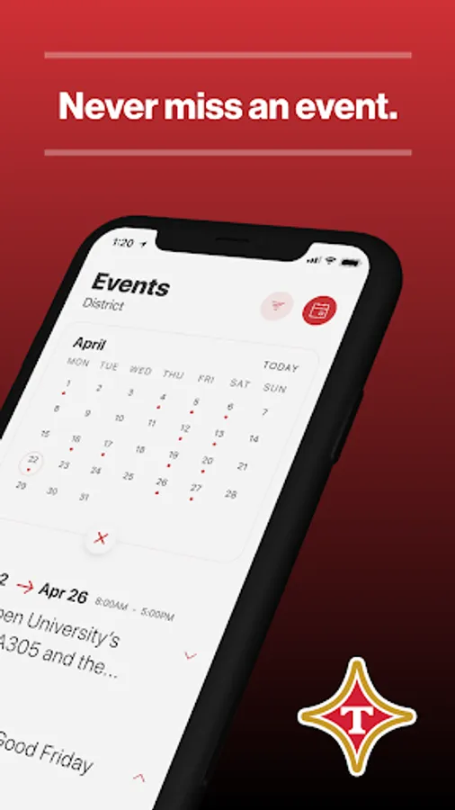 The event section shows a list of events throughout the district. Users can add an event to their calendar to share the event with friends and family with one tap.