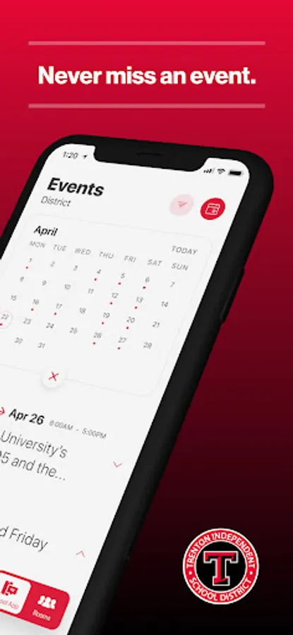 The event section shows a list of events throughout the district. Users can add an event to their calendar to share the event with friends and family with one tap.