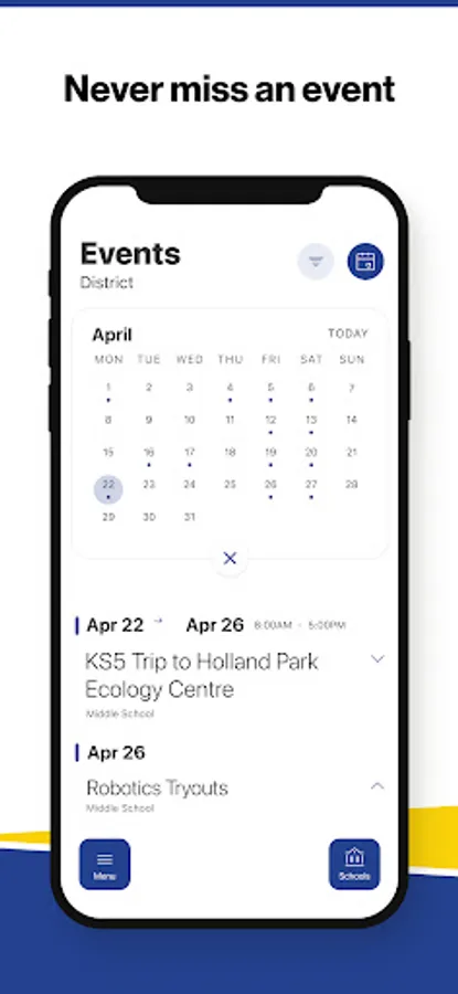 The event section shows a list of events throughout the district. Users can add an event to their calendar to share the event with friends and family with one tap.
