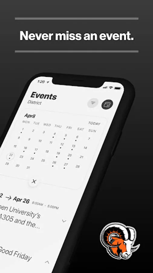 The event section shows a list of events throughout the district. Users can add an event to their calendar to share the event with friends and family with one tap.