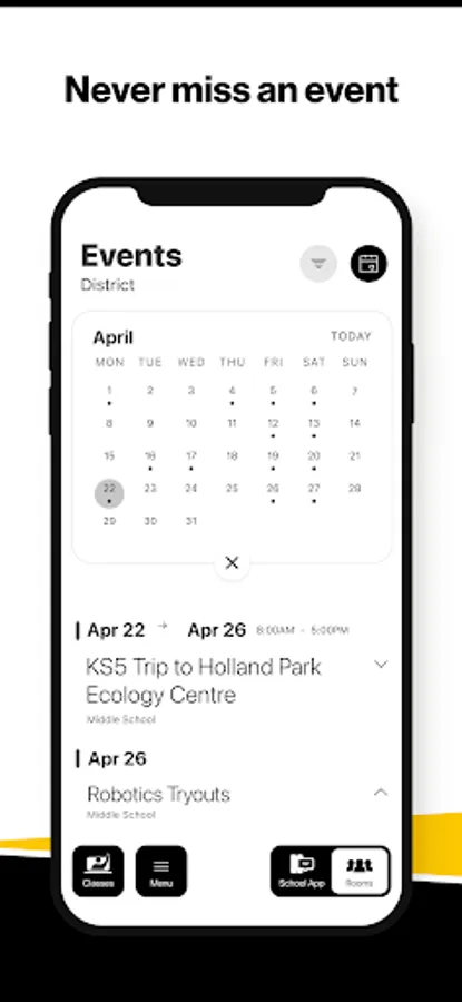 The event section shows a list of events throughout the district. Users can add an event to their calendar to share the event with friends and family with one tap.