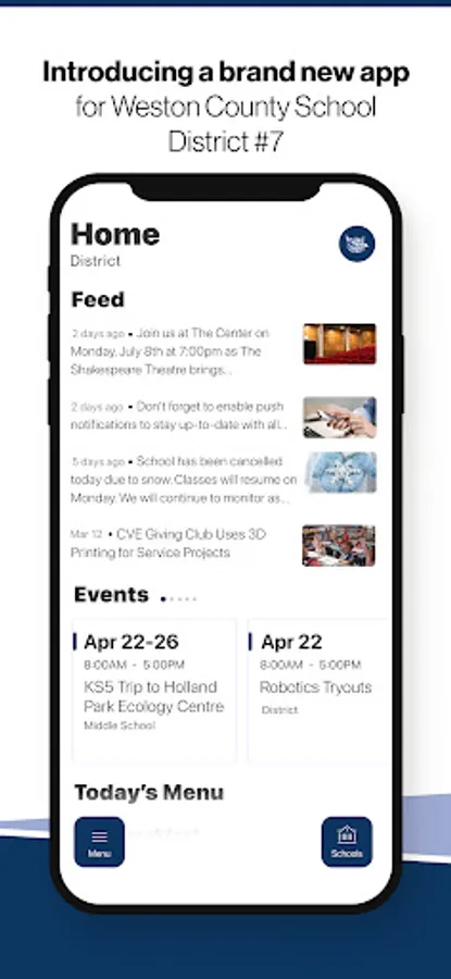 The event section shows a list of events throughout the district. Users can add an event to their calendar to share the event with friends and family with one tap.