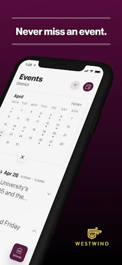 The event section shows a list of events throughout the district. Users can add an event to their calendar to share the event with friends and family with one tap.