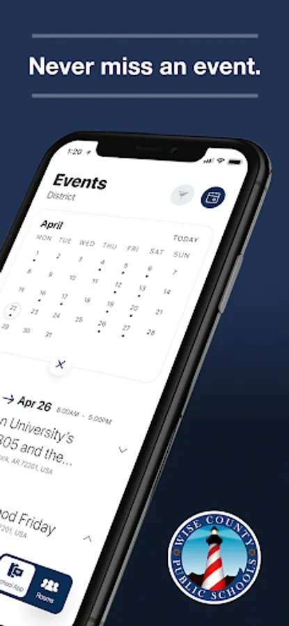 The event section shows a list of events throughout the district. Users can add an event to their calendar to share the event with friends and family with one tap.