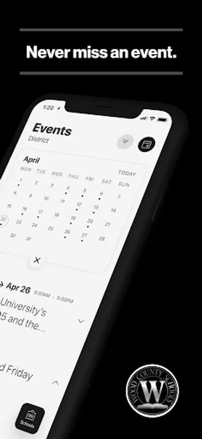 The event section shows a list of events throughout the district. Users can add an event to your calendar to share the event with friends and family with one tap.