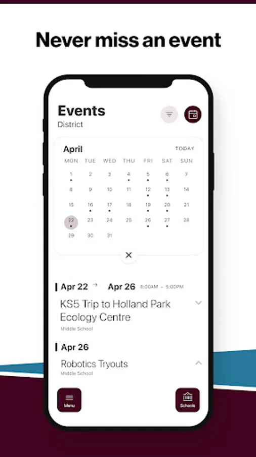 The event section shows a list of events throughout the district. Users can add an event to their calendar to share the event with friends and family with one tap.