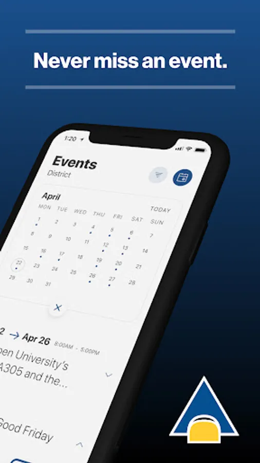 The event section shows a list of events throughout the district. Users can add an event to their calendar to share the event with friends and family with one tap.