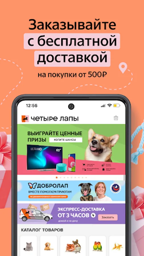 The free mobile application Four Paws is an online pet store in your smartphone. Food, drinkers, care products, feeders, carriers, houses, accessories and much more. Choose your favorite products for your pet, shop, and we will deliver them wherever you are.