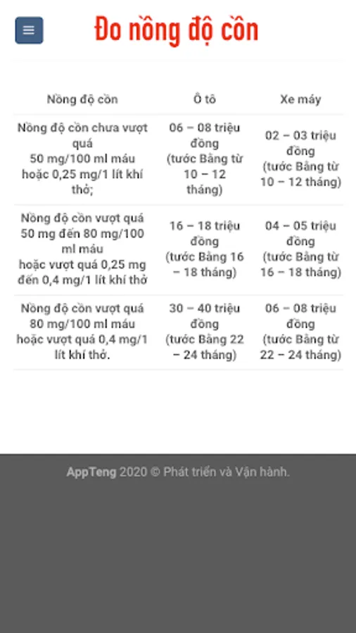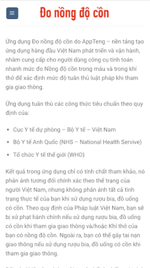 Alcohol measurement application developed and operated by AppTeng - the leading application creation platform in Vietnam, to provide users with a quick calculation tool for measuring the concentration of alcohol in the blood and breathing air to determine the level law compliance in traffic.