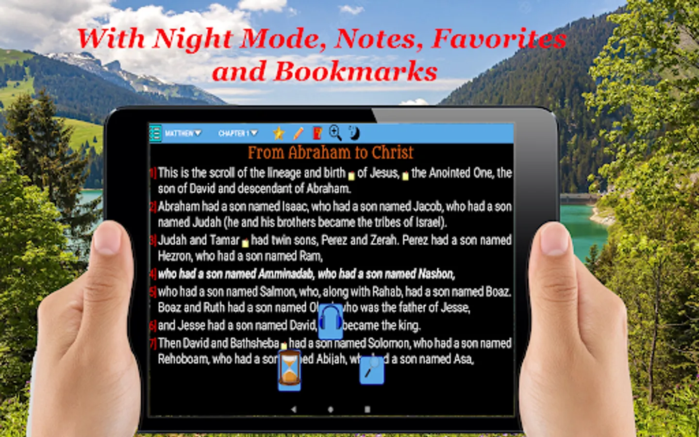 Access to the options menu quickly and sensibly. Option to change the text size. Change of reading background of the book. Access to favorite chapters and verses. Search for words in books, chapters and verses. Night mode to facilitate reading and decrease the light of the screen.