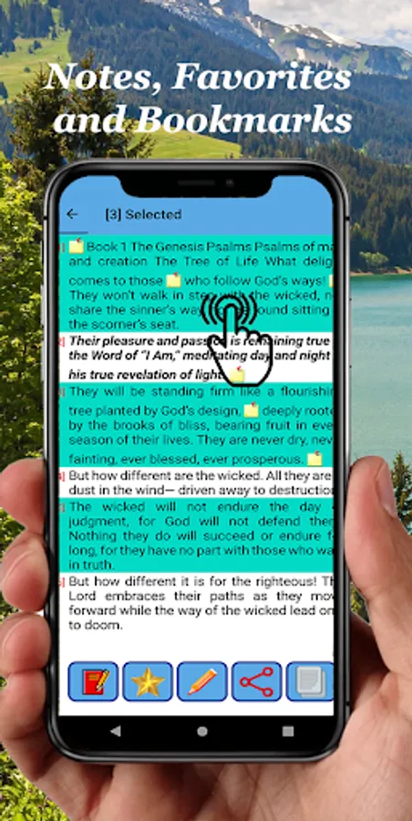 You can select one or several verses of a chapter and mark as a favorite you can also share with your friends the verses in the different social networks. By clicking on the favorite clip, you will see the verses that you marked for quick access.