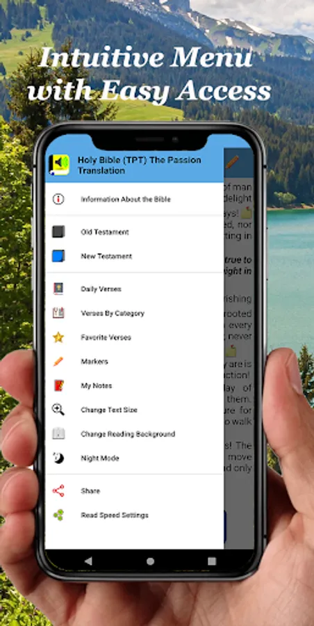 Access to the options menu quickly and sensibly. Option to change the text size. Change of reading background of the book. Access to favorite chapters and verses. Search for words in books, chapters and verses. Night mode to facilitate reading and decrease the light of the screen.