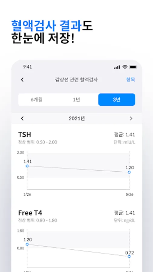 6. Blood test, weight, visit date management: Use Grandy to save and systematically manage blood test results (thyroid function test results) performed at the hospital. People with hyperthyroidism may lose weight, and people with hypothyroidism may gain weight. Also, if you are taking thyroid hormone medication, the required dosage may vary depending on your body weight. Record and save your weight with Grandi to monitor your weight changes. A blood test may be required if there is a rapid change in weight. Also, Grandy saves the hospital visit date and provides a notification when the hospital visit date is approaching.