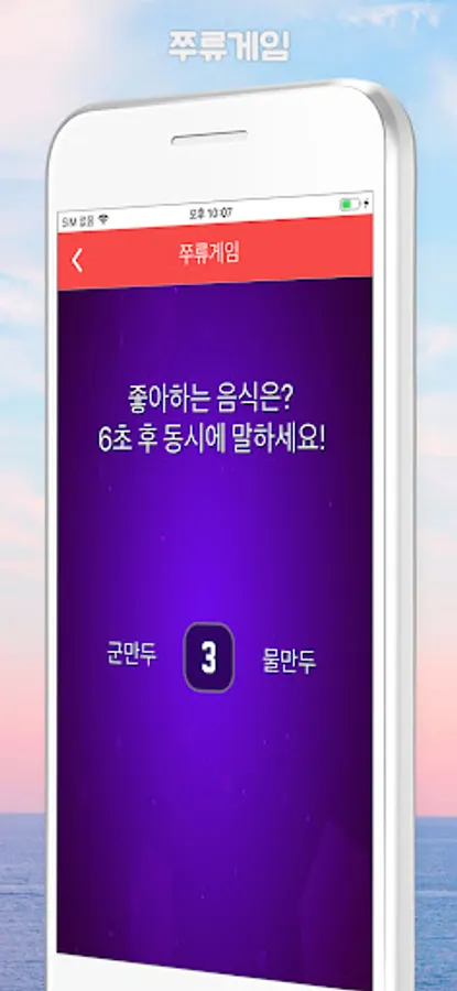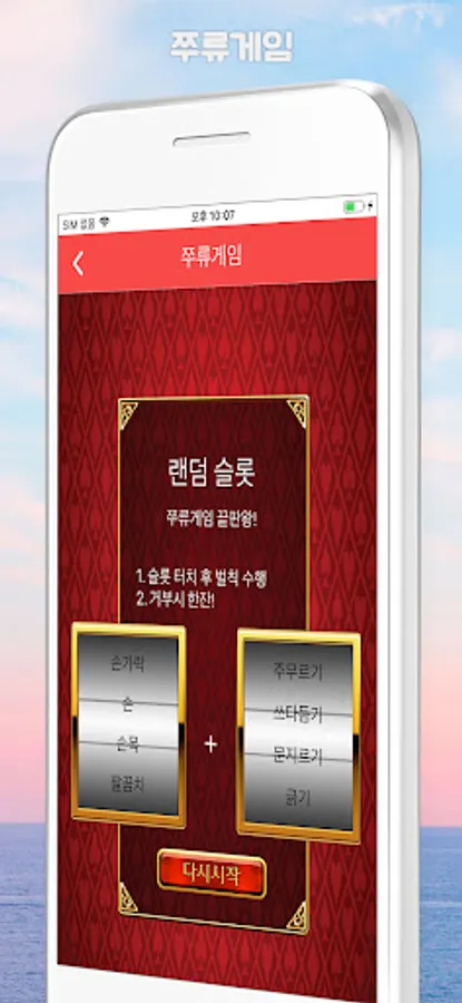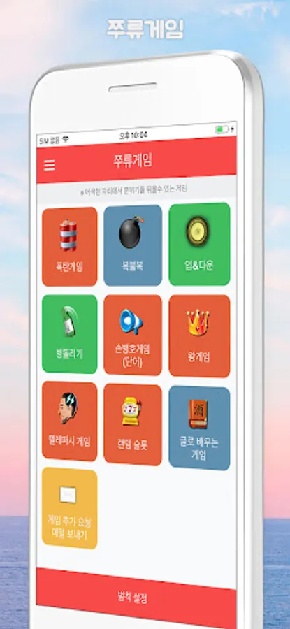 It consists of 8 simple and fun games (telepathy, random slot, bomb, bottle turn, hand Byeong-ho game, bokbulbok, stopper turn, king game).