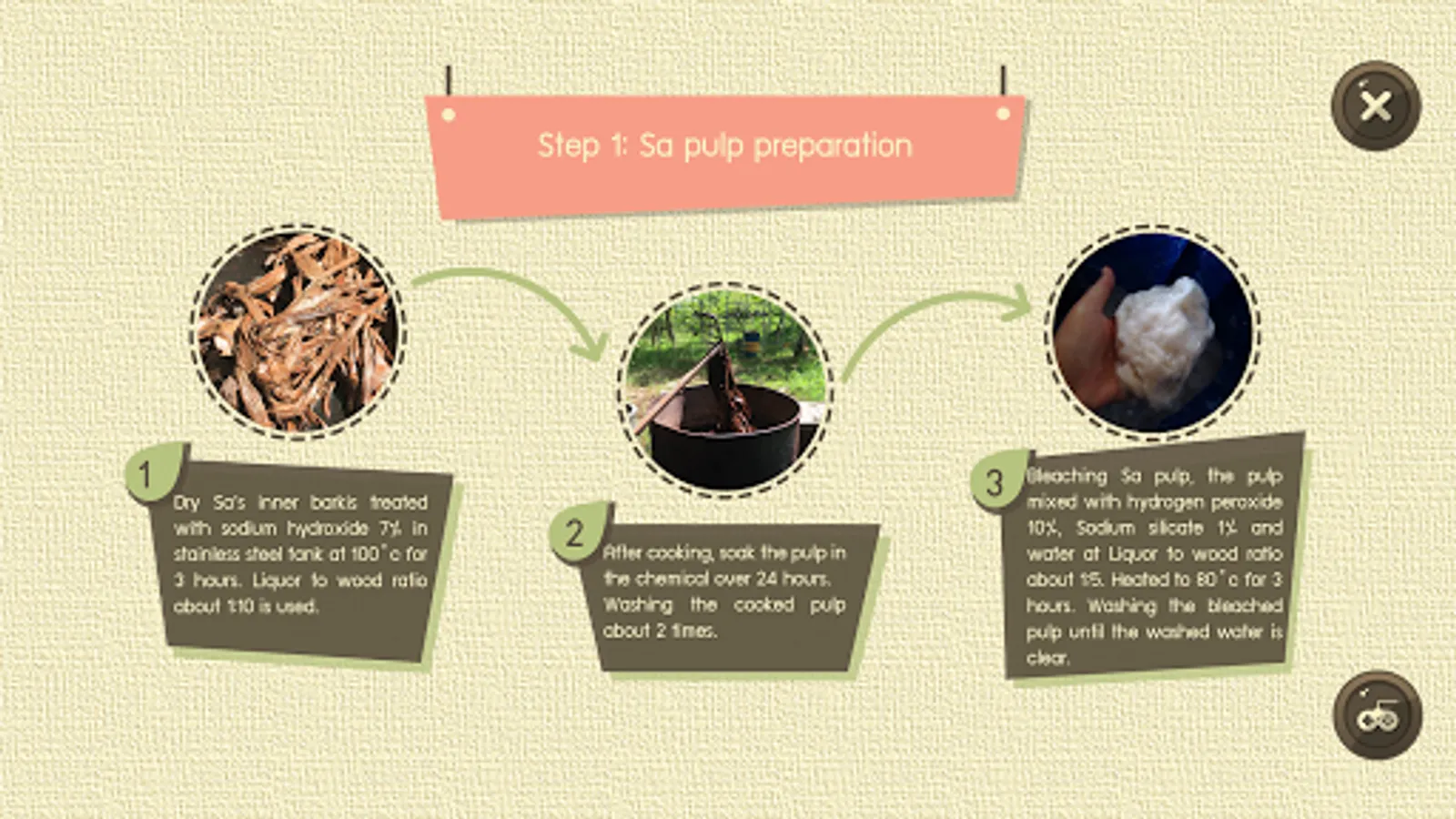 Use the application to explore Sa Paper Farm and learn about the 5 steps of “Sa” paper production, starting from the raw mulberry bark. If you can follow the process and answer the questions correctly then you will receive a souvenir at Sa Paper Farm. Enjoy your search!
