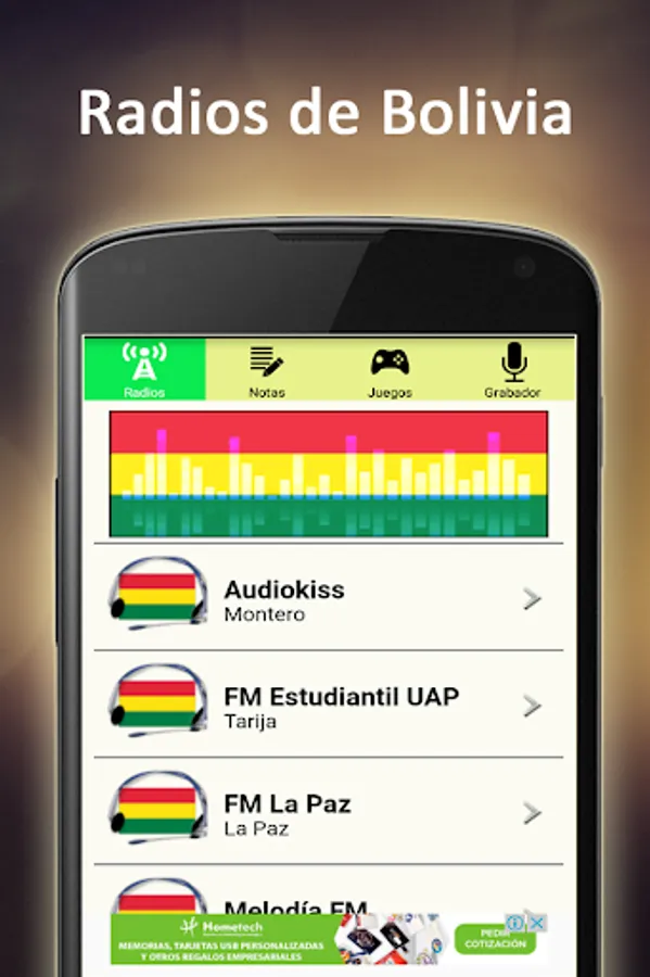 The radio of Bolivia in a single place in their hands, the stations of the main cities of Bolivia as they are La Paz, Cochabamba, Oruro, Santa Cruz encompassing most of the Bolivian territories in a single application of music and radios of Bolivia.