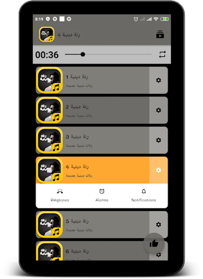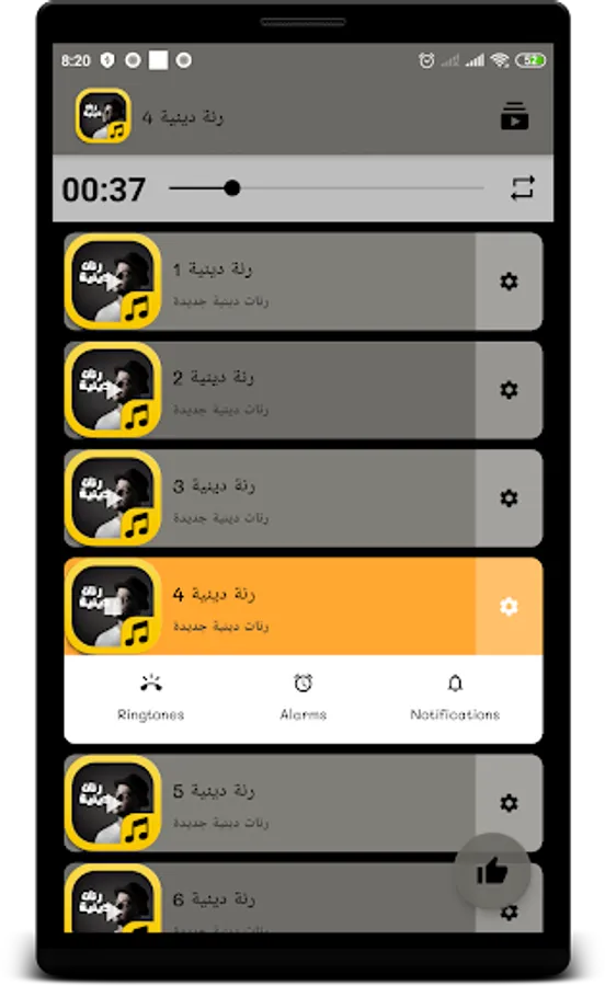 Categories within the application: children songs, quiet spiritual tones, ringtones Islamist without music, voice Duas religious, for months singers and artists in the Islamic world (Maher Zain, Sami Yusuf, Afasy .....)