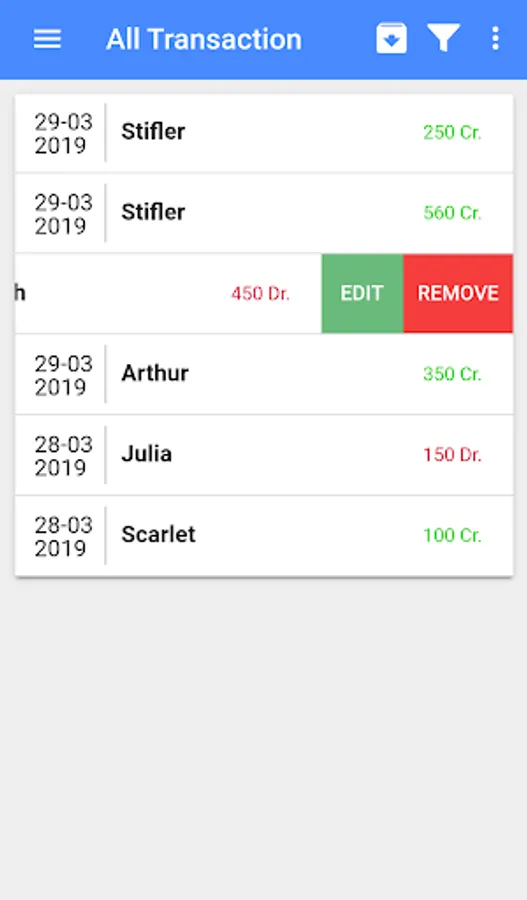 Flexible Entries: Add, Edit, Update and Delete Entry within Ledger / Account (Swap Left to Edit/Delete).