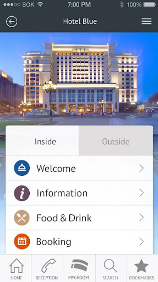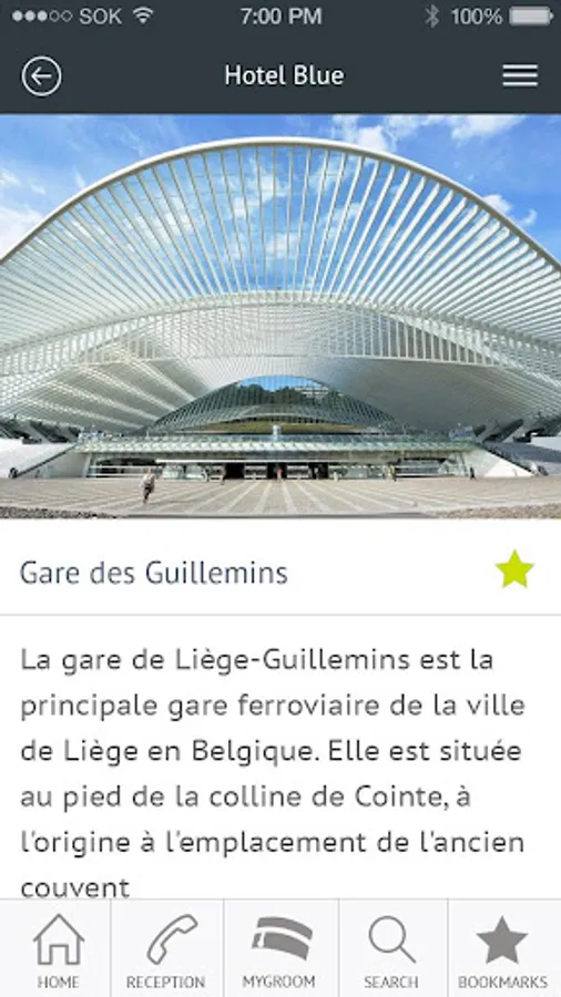 With GroomService, you have access to various services offered by your hotel (roomservice, spa, fitness center, ...) as well as recommendations on its direct environment (restraurants, museums, events, ...).