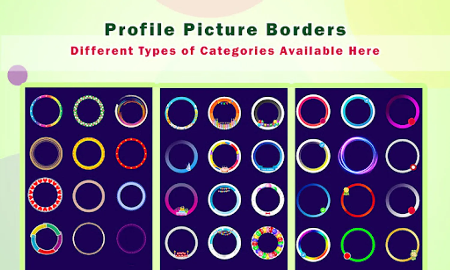 This App is loaded with huge collections of Neon, gradients, badge, text, patterns, birthdays, Love, Nature, and many more circular border frames for gorgeous pictures which allows creating awesome attractive Profile pics and DP.