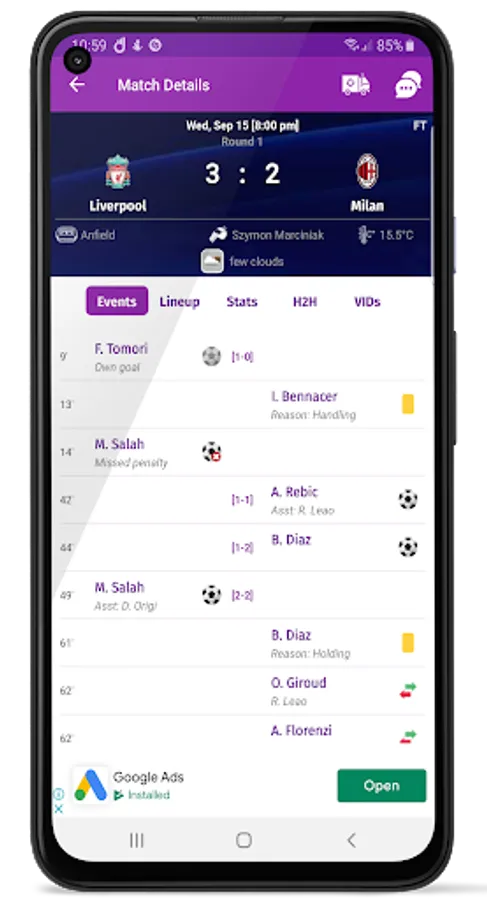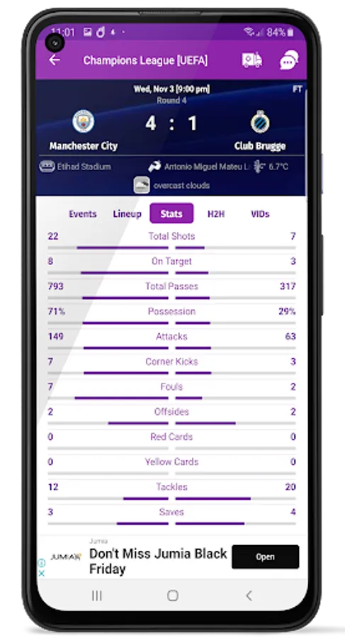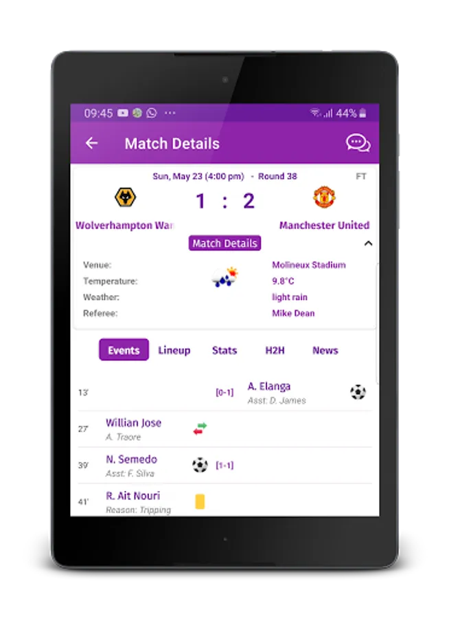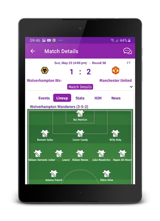 * Events, Lineup, Statistics, Head 2 Head, and News for each fixture