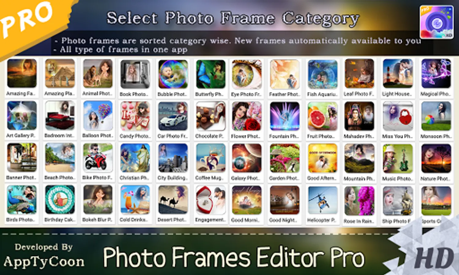 In short all in one photo are available in Photo Frames Editor Pro with Unlimited all type of photo frames , background & wallpaper collection provided online.