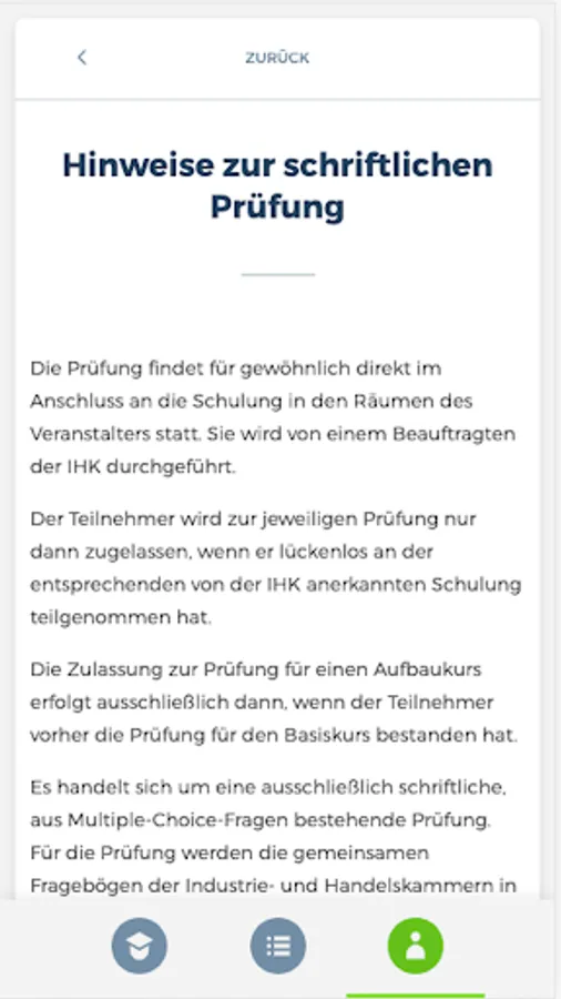 With the help of the realistic exam simulation you have the opportunity to test the knowledge you have previously acquired in the learning area. The framework conditions correspond to the general requirements of the Chamber of Industry and Commerce with regard to the time specifications, answer options, number of questions, etc. After a test run, a pass or fail is immediately shown in the statistics. In addition, a detailed evaluation can be carried out in which each individual question can be traced for "correctness".