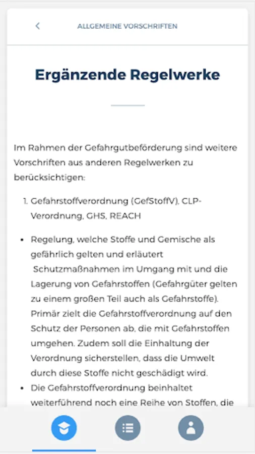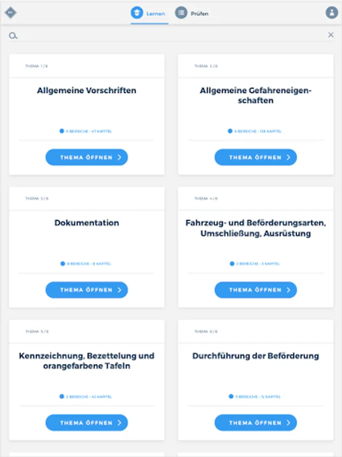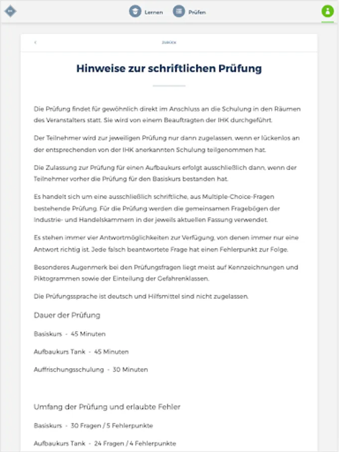 The app "Dangerous goods driver basic course" prepares you comprehensively for your upcoming theoretical examination to become a driver of dangerous goods (basic course) according to ADR & GGVSEB at the IHK. The combination of a learning and a testing area thus serves as ideal learning support. In addition, you are always able to view your current learning progress in order to be able to draw conclusions about any knowledge gaps.