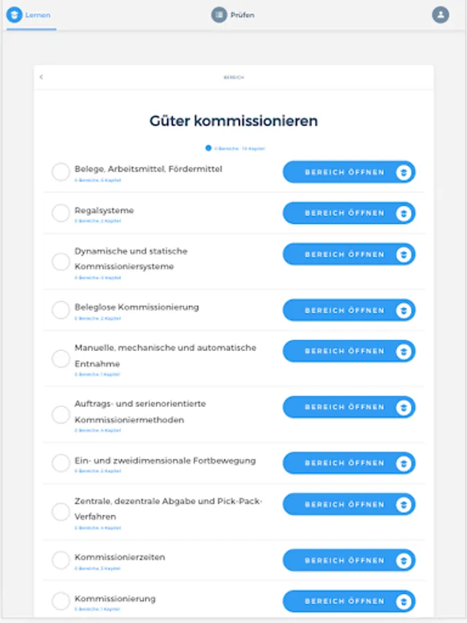 The "Warehouse Logistics (Specialist)" app prepares you comprehensively for your upcoming theoretical examination to become a specialist in warehouse logistics at the Chamber of Industry and Commerce. The combination of a learning and a testing area thus serves as ideal learning support. In addition, you are always able to view your current learning progress in order to be able to draw conclusions about any knowledge gaps.