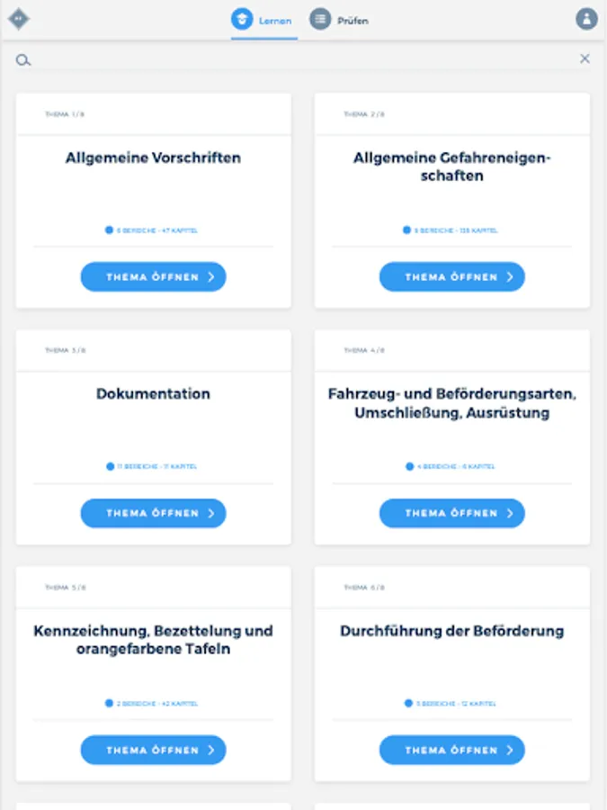 The app "Dangerous Goods Driver Refreshment" prepares you comprehensively for your upcoming theoretical examination to become a driver of dangerous goods (refresher course) according to ADR & GGVSEB at the Chamber of Industry and Commerce. The combination of a learning and a testing area thus serves as ideal learning support. In addition, you are always able to view your current learning progress in order to be able to draw conclusions about any knowledge gaps.