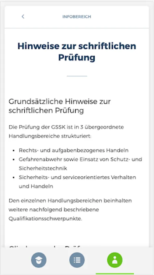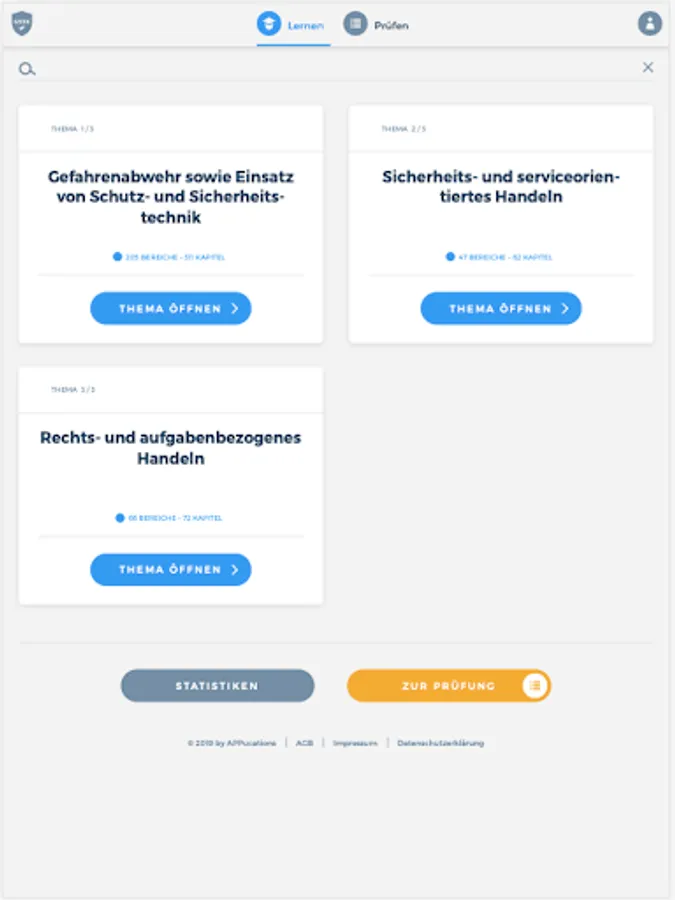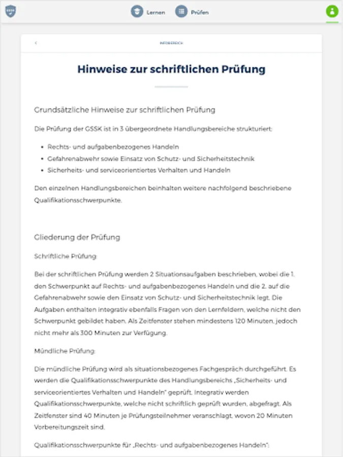 The "GSSK" app prepares you comprehensively for your forthcoming theoretical examination to become a certified protection and security officer at the Chamber of Industry and Commerce. The combination of a learning and a testing area thus serves as ideal learning support. You are also able to display your current learning progress at any time in order to be able to draw conclusions about any knowledge gaps.