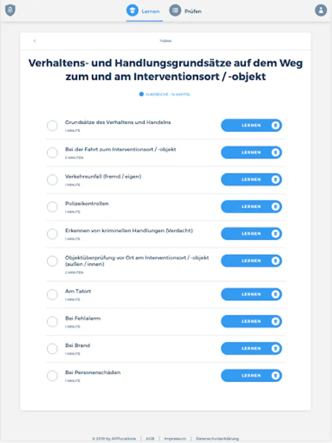 The "Intervention Force" app prepares you comprehensively for your upcoming theoretical test according to VdS standard 2172 on intervention force. The combination of a learning and a testing area thus serves as ideal learning support. In addition, you are always able to view your current learning progress in order to be able to draw conclusions about any knowledge gaps.