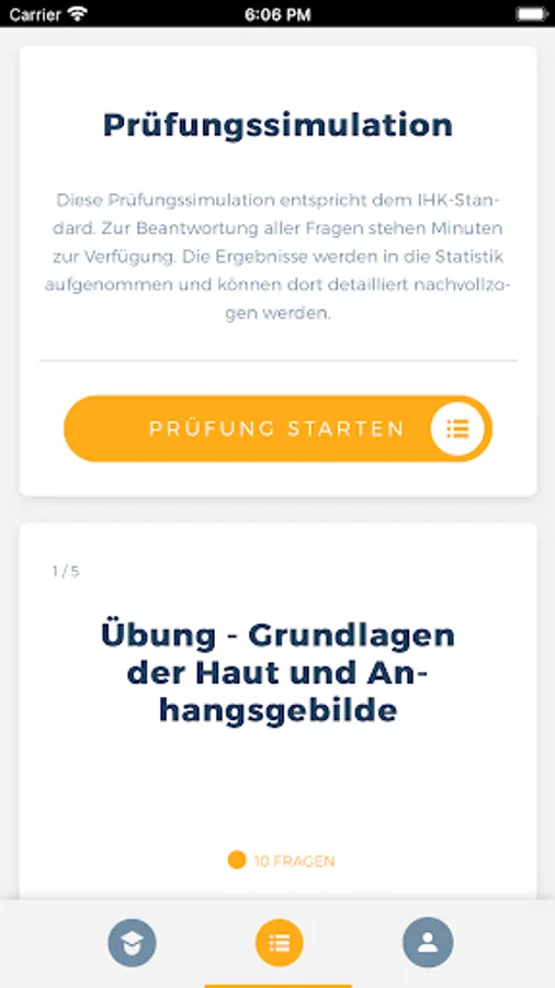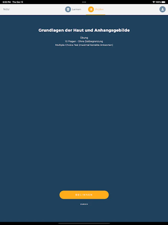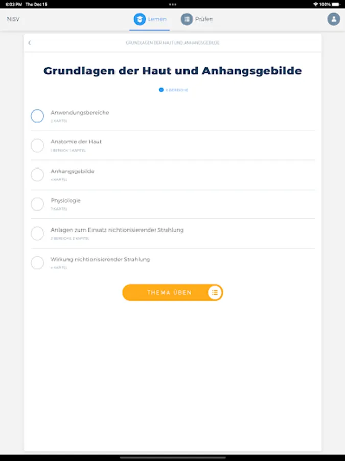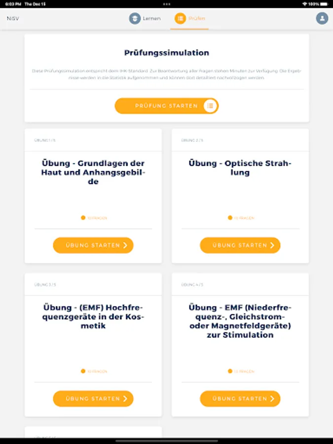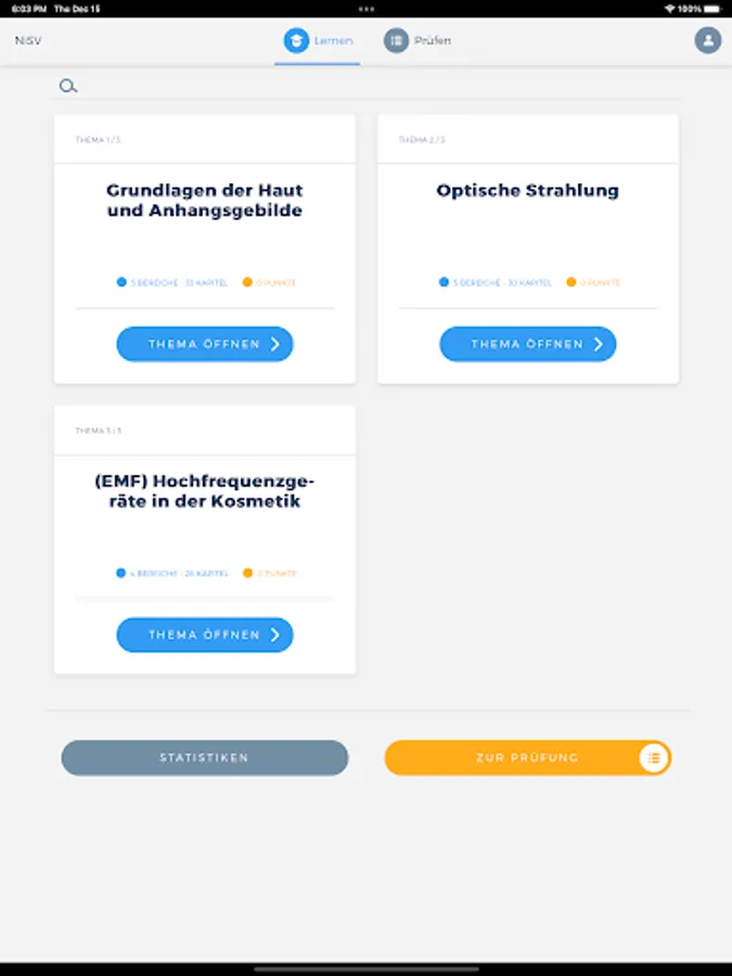 Independent preparation is supported by the "NiSV" app. It contains both well-structured learning content, exam-related questions and personalized statistics. Strengths and weaknesses are immediately recognizable through a detailed evaluation.