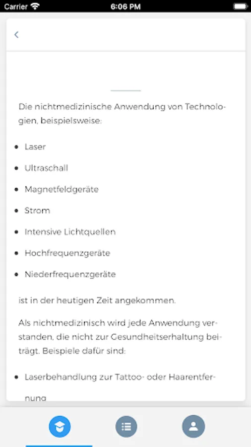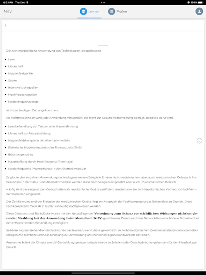 With the NiSV app, you can access the relevant learning content offline and from any location at any time and test the knowledge you have already acquired in an exercise or exam simulation. Treatment with non-ionizing radiation on people may only take place if the practitioner has successfully passed the examination according to NiSV.