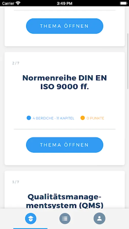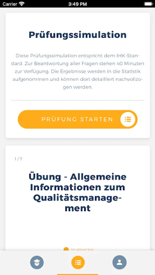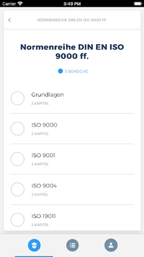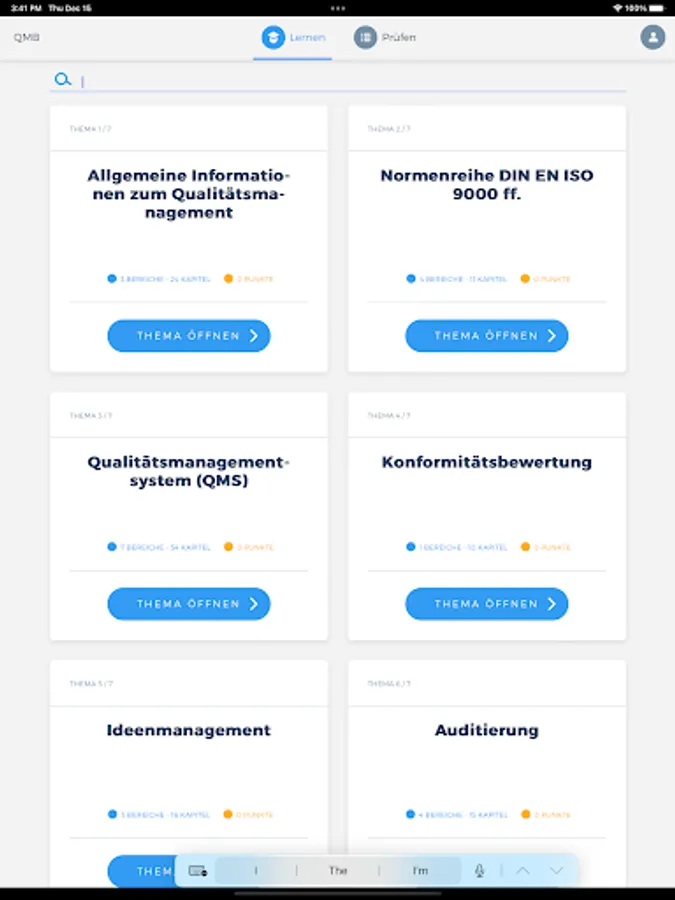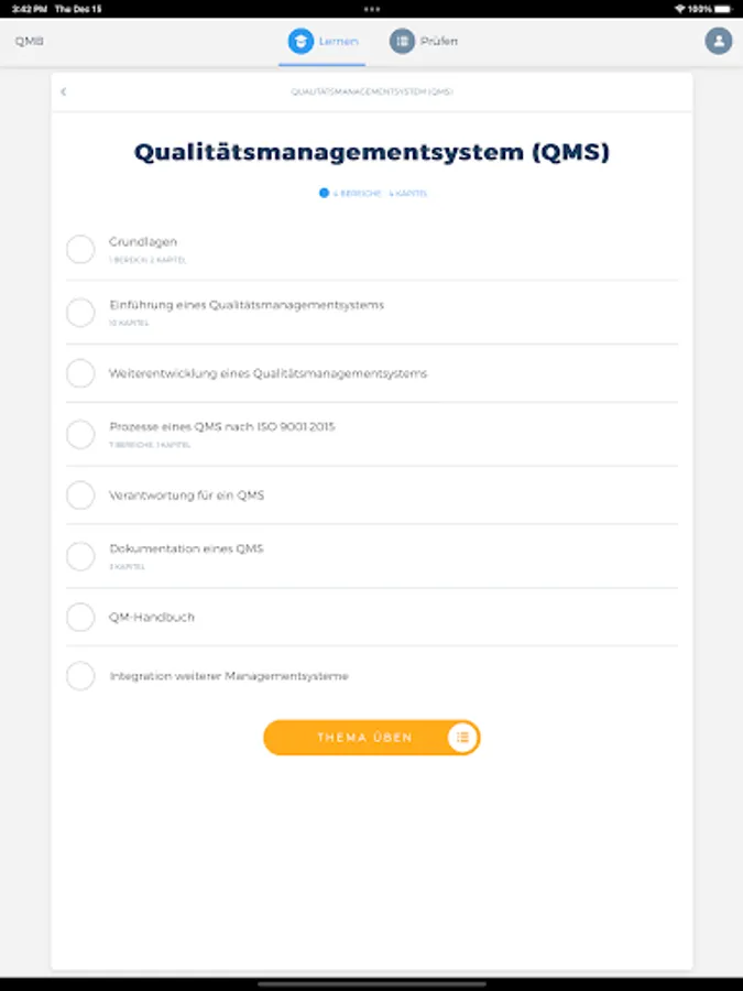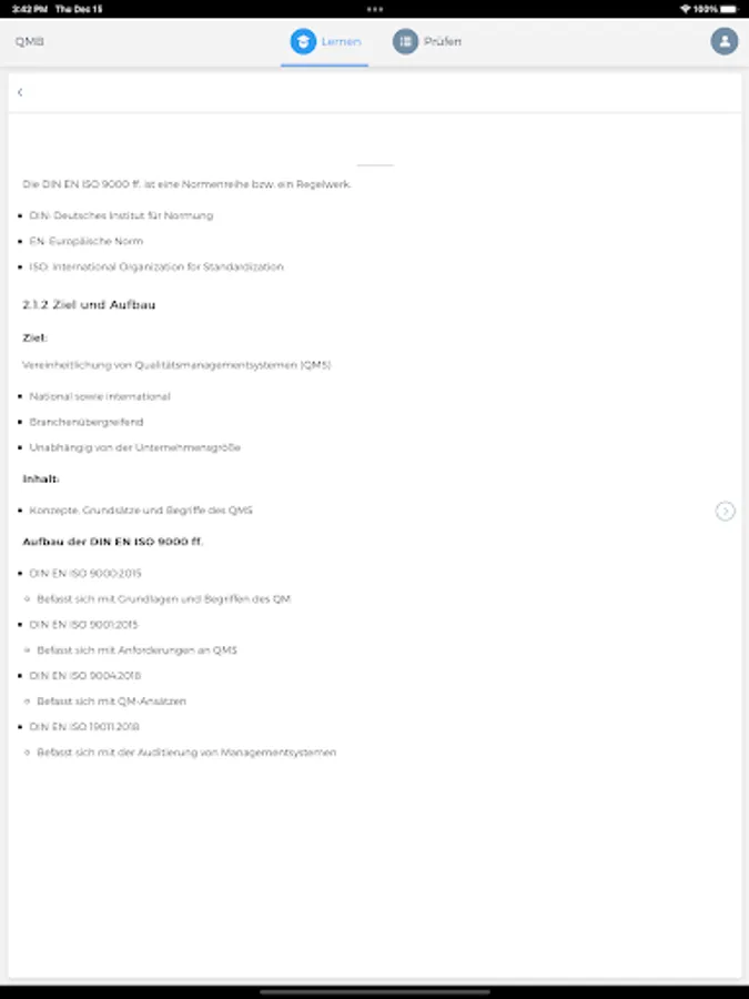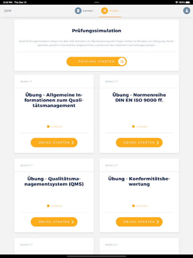 With the QMB app, you can access the relevant learning content of a quality management officer (QMB) offline and from any location at any time and query the knowledge you have already acquired in an exercise or exam simulation. You are also able to display your current learning progress at any time in order to be able to draw conclusions about any knowledge gaps.