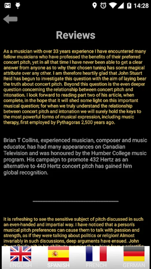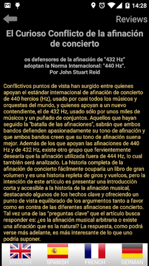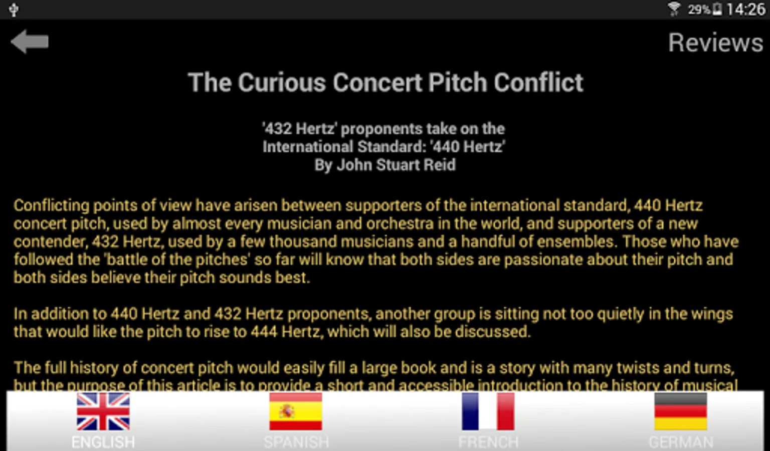 For those interested in the subject of concert pitch, an article on this subject is included in English, Spanish and German.