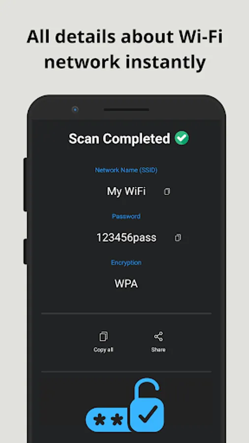 A handy tool to scan any WiFi QR Code, get passwords and WiFi information. You can also create your own WiFi QR Code to share your WiFi easily.