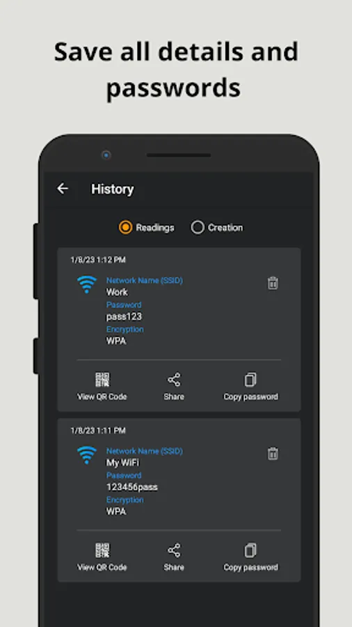 Want to share your WiFi password with friends, clients or customers? The app also has a WiFi QR Code creator! Create and share a WiFi QR Code in a few seconds with our app.