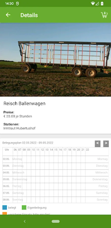 The calendar shows when the devices are free and which period you have occupied yourself. Detailed information describes the rental machines and the rental prices are stored. If you have any questions, please contact the office of Maschinenring Taunus-Westerwald GmbH.