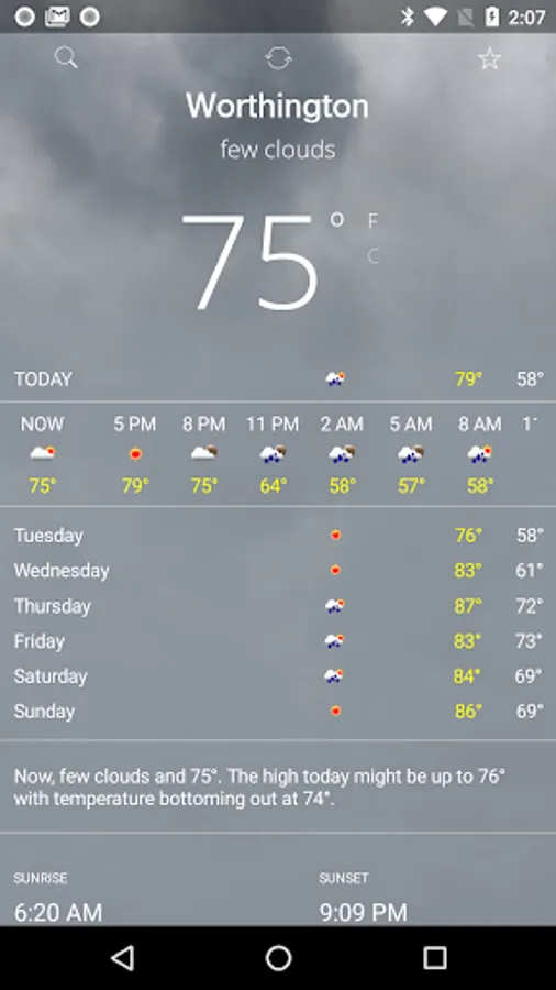 Beautifully designed Weather application for Android 4.2 or higher. Forecast includes current condition and 8 days of forecast data, high/low, Wind condition and barometric pressure.