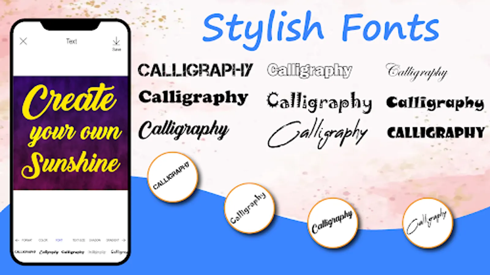 If you love to add text on pictures or backgrounds or thoughts, Calligraphy App is the best app to add text with this calligraphic fonts focus and filter app provides 100+ beautiful backgrounds and 75+ gradients along with bg colors.Write any text on photo with different colors of your choice and different stylish fonts using this brush lettering app /calligraphy fonts for android.