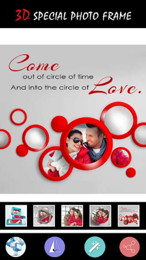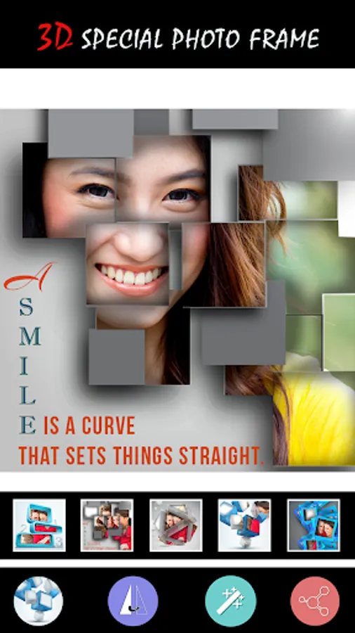 Would you like your pictures to be appearing in the beautiful 3d special effect photo frames? These 3d special effect photo frames are ideal for you to frame your surreal photography memories and make them unforgettable.Using this 3d picture effects app you can make photos more beautiful and wonderful by decorating them with fantastic free 3 text font style 3d on photo frames and pinch photo effects.3D special effect photo editor give a look to your photo like a poster collage.