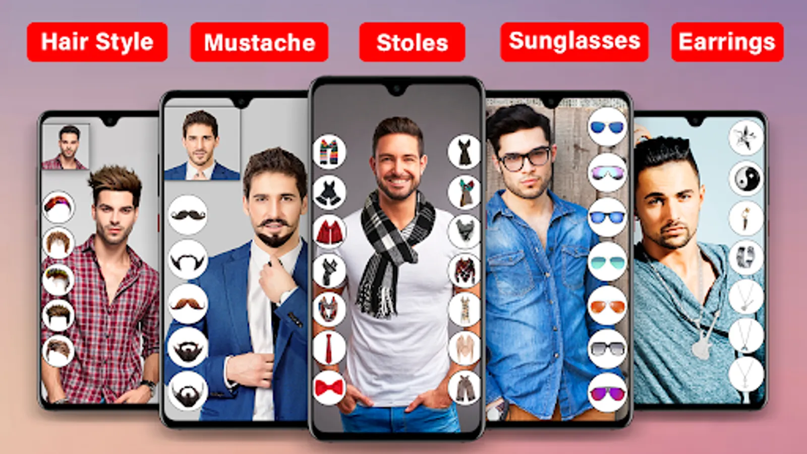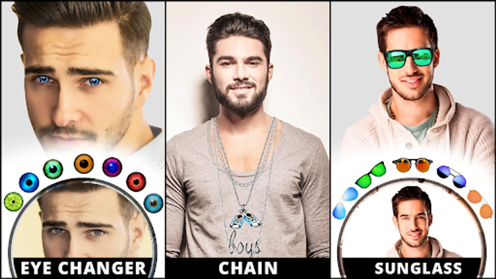 Add men accessories like modern sunglasses, caps, stoles, ties, chains and earrings by all in one men photo editor makes the complete men beauty makeup app.