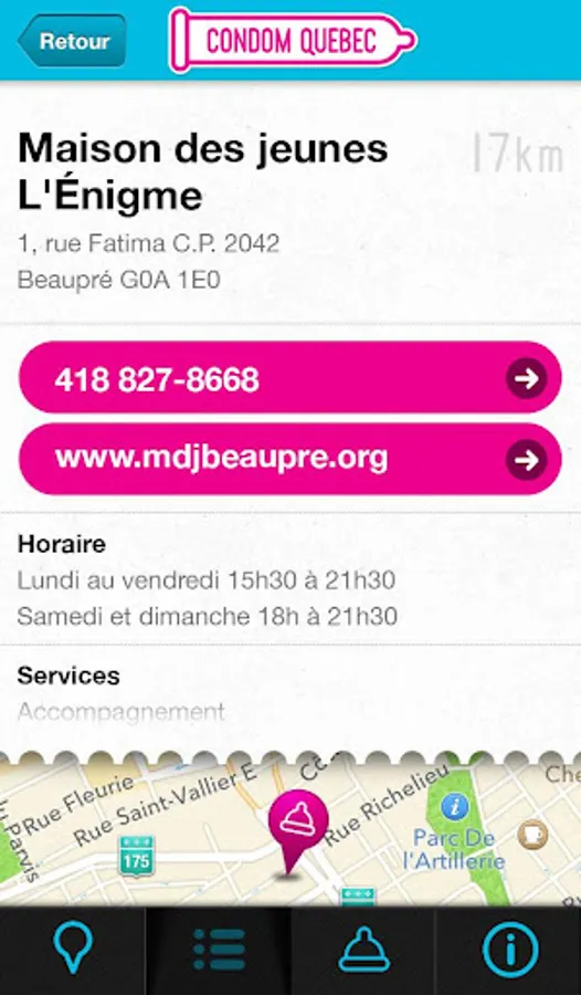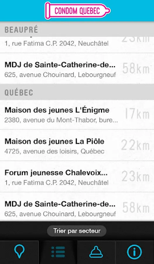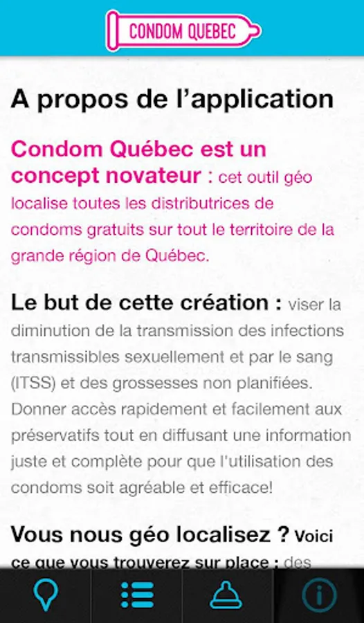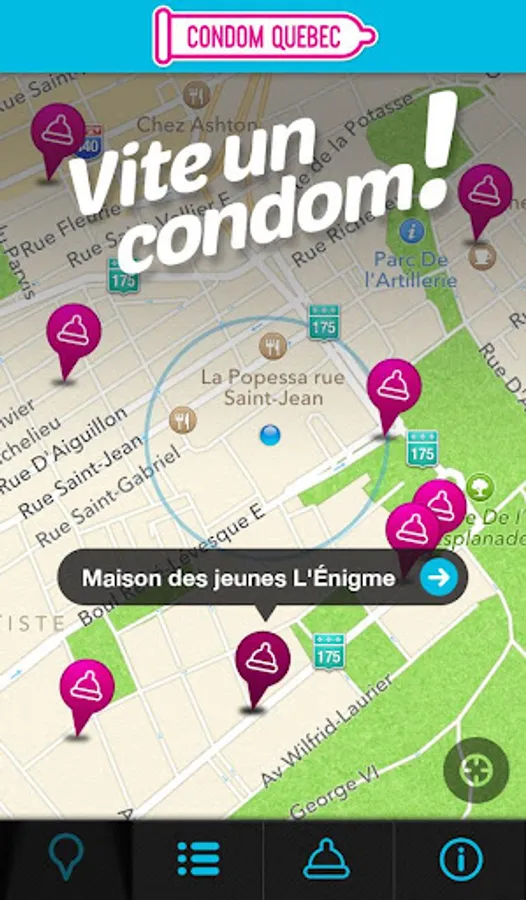 Quickly find a free condom using the Condom Québec app! In addition to promoting the accessibility of condoms and information, this application aims to demystify the tools for preventing sexually transmitted infections (STBBIs) and unplanned pregnancies. This tool allows you to quickly locate community youth organizations that distribute condoms for FREE and where workers are available to answer questions. The Condom Québec application was designed by a group of community organizations promoting health among adolescents in the Capitale-Nationale region (Régional des maisons de jeunes de Québec, MIELS-Québec and S.O.S. Grossesse). This initiative funded by the Youth Forum of the Capitale-Nationale region (FJRCN).