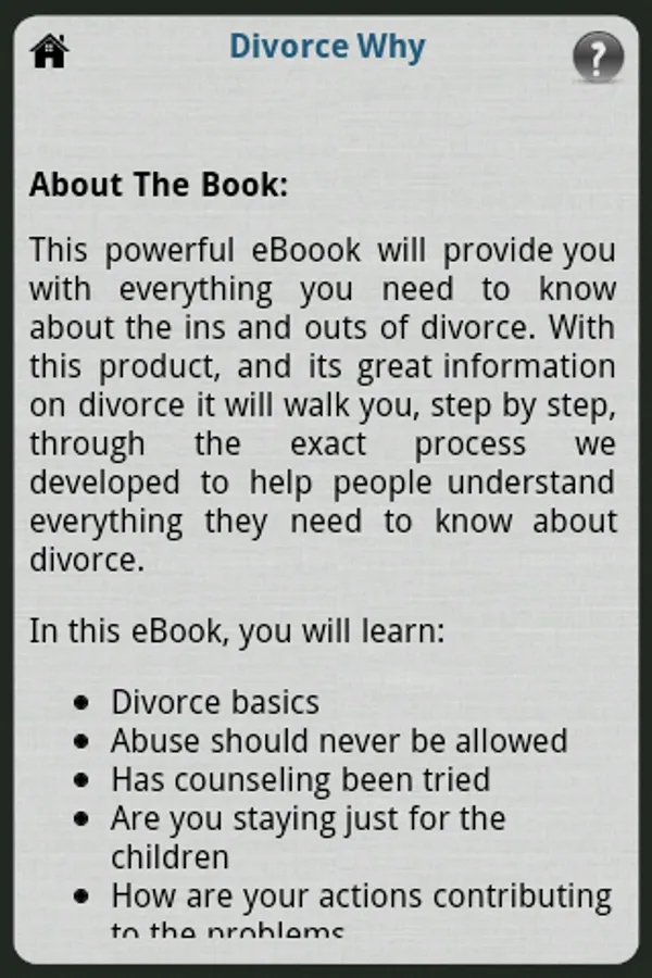 Divorce Why? - This powerful eBoook will provide you with everything you need to know about the ins and outs of divorce. With this product, and its great information on divorce it will walk you, step by step, through the exact process we developed to help people understand everything they need to know about divorce.