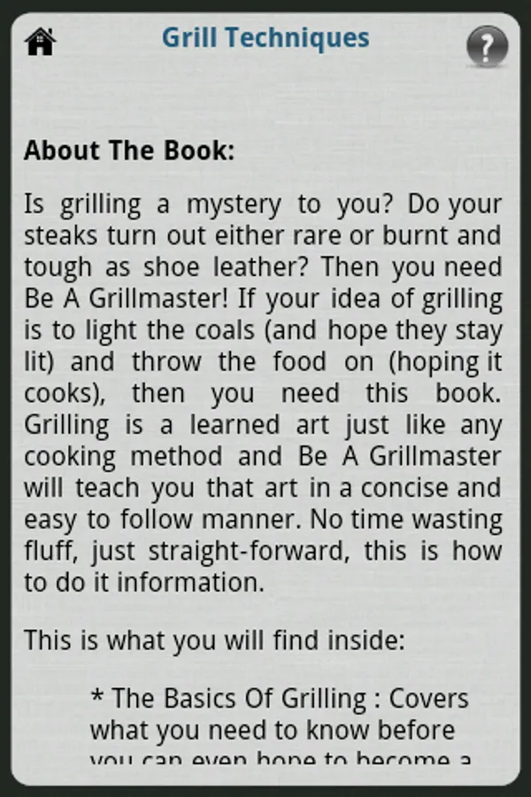 Grill Techniques - Is grilling a mystery to you? Do your steaks turn out either rare or burnt and tough as shoe leather? Then you need Be A Grillmaster! If your idea of grilling is to light the coals (and hope they stay lit) and throw the food on (hoping it cooks), then you need this book. Grilling is a learned art just like any cooking method and Be A Grillmaster will teach you that art in a concise and easy to follow manner. No time wasting fluff, just straight-forward, this is how to do it information.