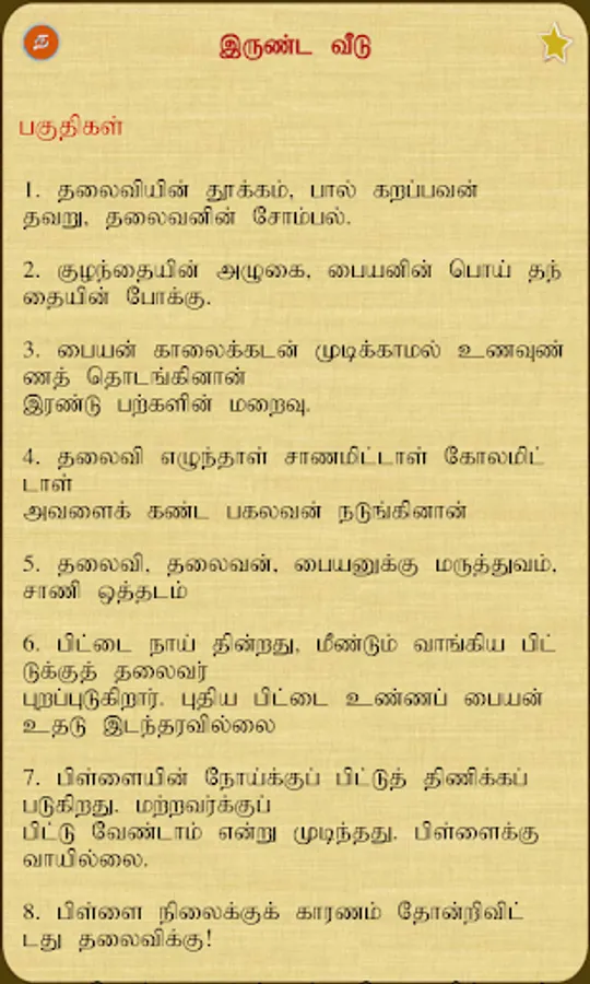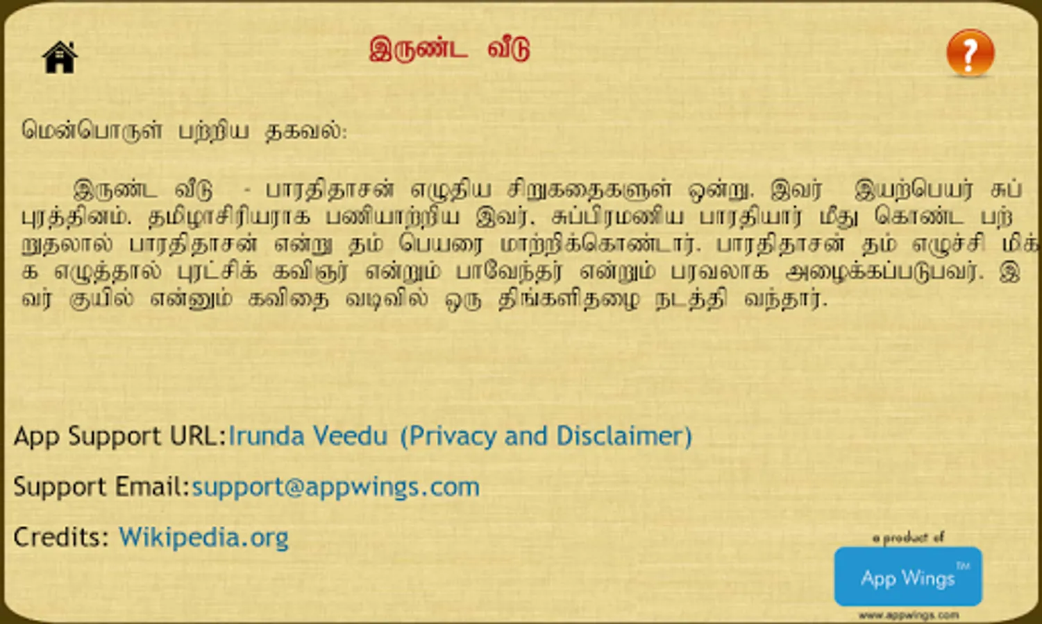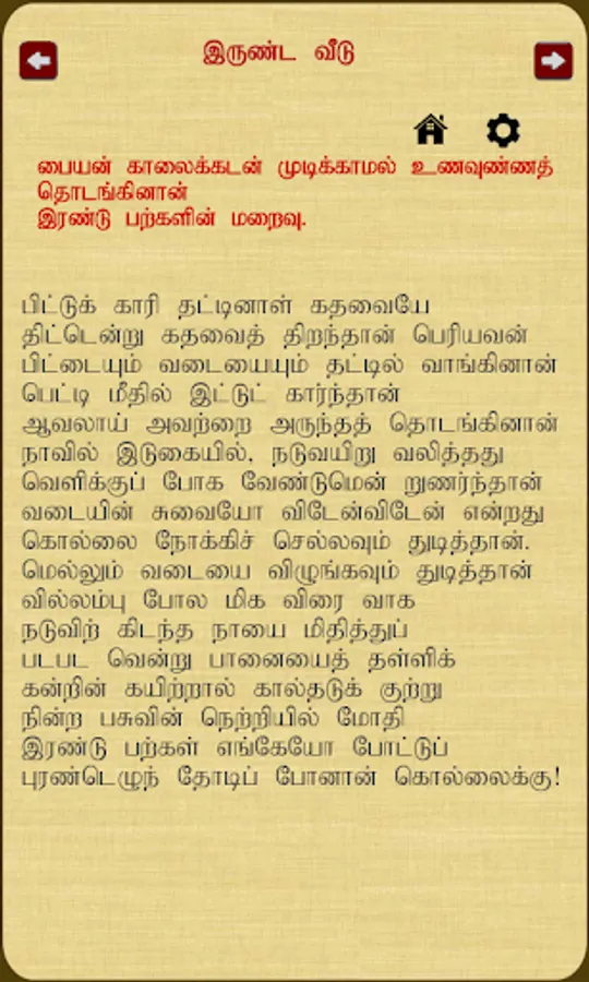 Irunda Veedu - Written by Bharathidasan (April 29, 1891 – April 21, 1964; also spelt Bharatidasan) was a 20th-century Tamil poet and rationalist whose literary works handled mostly socio-political issues. His writings served as a catalyst for the growth of the Dravidian movement in Tamil Nadu. In addition to poetry, his views found expression in other forms such as plays, film scripts, short stories and essays. He was mentored by Mahakavi Subramanya Bharathi (after whom he called himself "Bharathidasan").