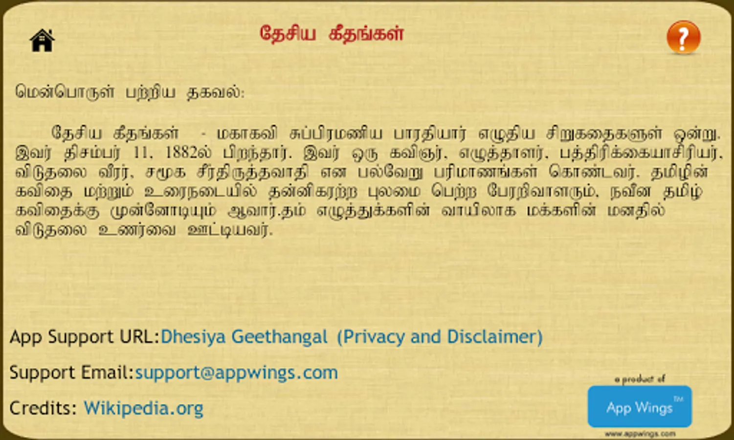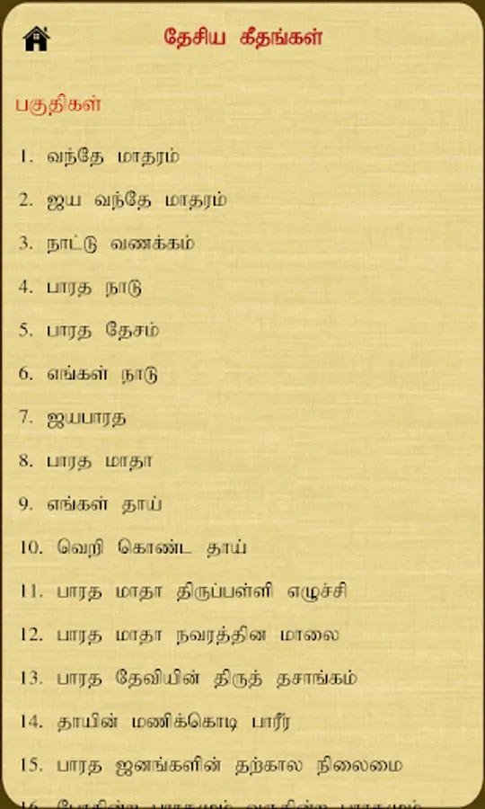 Desiya Geethangal - Written by Chinnaswami Subramania Bharati (December 11, 1882 – September 11, 1921) was an Indian writer, poet, journalist, Indian independence activist and social reformer from Tamil Nadu, India. Popularly known as Mahakavi Bharathiyar, he is a pioneer of modern Tamil poetry.